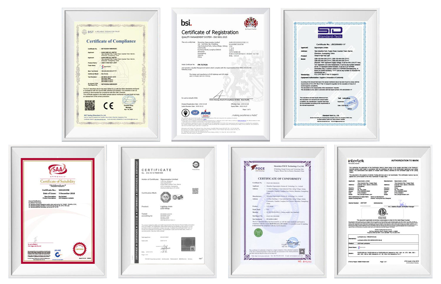 Tous les produits sont certifiés CE et ROHS, certains produits sont conformes aux normes FCC, UL et Energy Star.